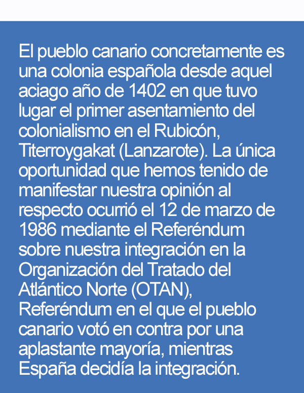 El pueblo canario concretamente es una colonia española desde aquel aciago año de 1402 en que tuvo lugar el primer asentamiento del colonialismo en el Rubicón, Titerroygakat (Lanzarote). La única oportunidad que hemos tenido de manifestar nuestra opinión al respecto ocurrió el 12 de marzo de 1986 mediante el Referéndum sobre nuestra integración en la Organización del Tratado del Atlántico Norte (OTAN), Referéndum en el que el pueblo canario votó en contra por una aplastante mayoría, mientras España decidía la integración. Ya nos hemos autodeterminado por lo tanto. Nadie nos preguntó jamás si queríamos ser parte de España, muy al contrario, mediante una cruel, vil y sanguinaria guerra que duró desde 1402 hasta 1495 con la claudicación de Chinet (Tenerife), casi cien años por lo tanto, el régimen monárquico y colonial español ha sometido implacablemente a nuestro pueblo, con guante de seda y mano de hierro. Sólo procede por lo tanto proceder a la descolonización e independencia de nuestra patria.