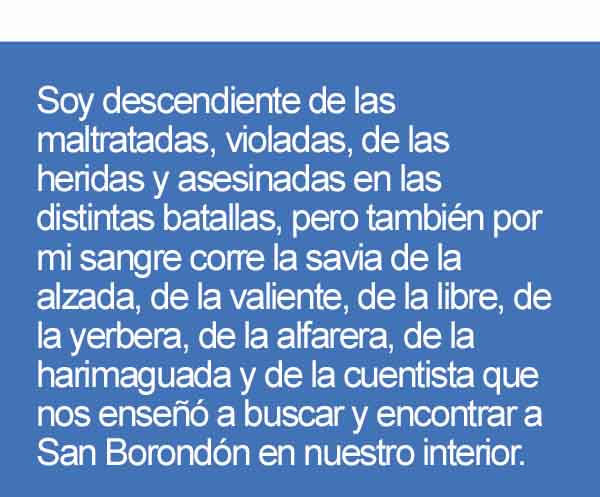Soy descendiente de las maltratadas, violadas, de las heridas y asesinadas en las distintas batallas, pero también por mi sangre corre la savia de la alzada, de la valiente, de la libre, de la yerbera, de la alfarera, de la harimaguada y de la cuentista que nos enseñó a buscar y encontrar a San Borondón en nuestro interior. La Isla interna en la que todo nuestro tesoro es puro conocimiento, que aguarda el momento de ser transmitido, y despertar así del sueño que me impide liberar el amor que compartimos. Ese amor libre que, como el silbo, corre de cumbre en cumbre, pasando por los barrancos hasta llegar como un profundo susurro a tu alma. Ese mensaje silbado permite que vibremos con el tambor y que nuestras risas acompañen a las chácaras alegres.