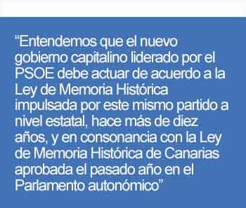 “Entendemos que el nuevo gobierno capitalino liderado por el PSOE debe actuar de acuerdo a la Ley de Memoria Histórica impulsada por este mismo partido a nivel estatal, hace más de diez años, y en consonancia con la Ley de Memoria Histórica de Canarias aprobada el pasado año en el Parlamento autonómico”, aseguran desde la Junta Republicana de Canarias.