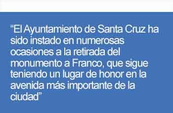 “El Ayuntamiento de Santa Cruz ha sido instado en numerosas ocasiones a la retirada del monumento a Franco, que sigue teniendo un lugar de honor en la avenida más importante de la ciudad”, asegura la organización republicana. Tanto los grupos políticos como la sociedad civil han denunciado en numerosas ocasiones el incumplimiento de la Ley de Memoria Histórica que sufre la ciudad con el mantenimiento del monumento al dictador.