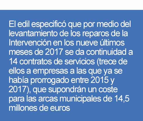 El edil especificó que por medio del levantamiento de los reparos de la Intervención en los nueve últimos meses de 2017 se da continuidad a 14 contratos de servicios (trece de ellos a empresas a las que ya se había prorrogado entre 2015 y 2017), que supondrán un coste para las arcas municipales de 14,5 millones de euros.