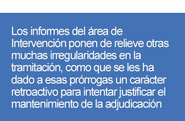 Los informes del área de Intervención ponen de relieve otras muchas irregularidades en la tramitación, como que se les ha dado a esas prórrogas un carácter retroactivo para intentar justificar el mantenimiento de la adjudicación. En este sentido advierte que “la retroactividad de un acto es excepcional y en esta actuación se utiliza de manera general”, y que “la aprobación del acto de manera retroactiva impide una ejecución de otras cláusulas del Convenio”.