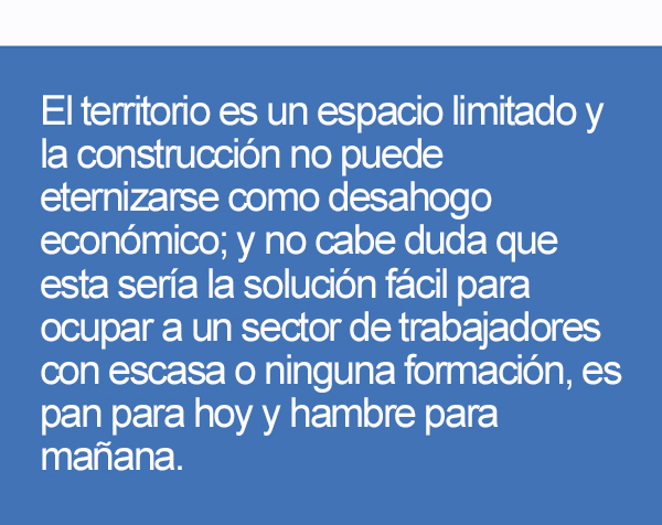 De todas formas, el territorio es un espacio limitado y la construcción no puede eternizarse como desahogo económico; y no cabe duda que esta sería la solución fácil para ocupar a un sector de trabajadores con escasa o ninguna formación, es pan para hoy y hambre para mañana. Si de verdad preocupara el acceso al trabajo, la pobreza…, habría que afrontar la necesidad de formación laboral y reorientar la economía con miras de futuro. La Ley del Suelo es solo un parcheo, que podría dañar irremediablemente el territorio y agotar uno de nuestros mayores bienes; que no es otro que el medioambiente natural y el actual aspecto de nuestra fauna y flora.