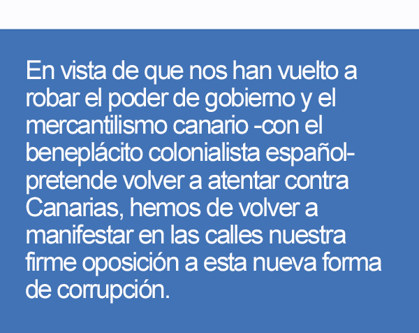 No vamos a esperar las sentencias de una justicia tan lenta como la española, que ejecuta al borde de la prescripción o más allá. No podemos permitir que el territorio quede irremediablemente dañado. No nos vamos a vender por unas pocas migajas, ni por un poco más. No vamos a aceptar que se construyan más tramas corruptas a costa de nuestra tierra, de nuestro medioambiente, y se sacrifique nuestro futuro desde el oscurantismo de nuestra institución principal. Así que, en vista de que nos han vuelto a robar el poder de gobierno y el mercantilismo canario -con el beneplácito colonialista español- pretende volver a atentar contra Canarias, hemos de volver a manifestar en las calles nuestra firme oposición a esta nueva forma de corrupción.
