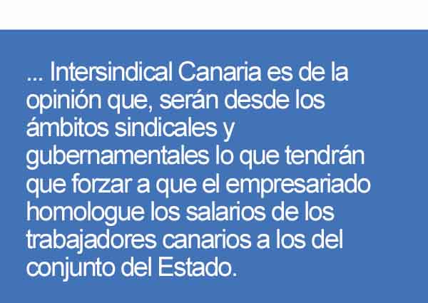 Para invertir esta indeseable situación y una vez contrastada la negativa de la patronal canaria a asumir voluntariamente comportamientos más proclives a un justo reparto de la riqueza, Intersindical Canaria es de la opinión que, serán desde los ámbitos sindicales y gubernamentales lo que tendrán que forzar a que el empresariado homologue los salarios de los trabajadores canarios a los del conjunto del Estado. Los sindicatos “mayoritarios” UGT y CC.OO abandonando su posición entreguista para forzar incrementos muy superiores en la negociación colectiva; y desde el Gobierno canario y estatal, haciendo condicionar cualquier tipo de incentivo, subvención o desgravación fiscal al empresariado, a que esta asuma un reparto racional de sus beneficios con una incremento salarial justo que destierre la segregación que en materia salarial y  laboral recaen sobre los trabajadores del País Canario.