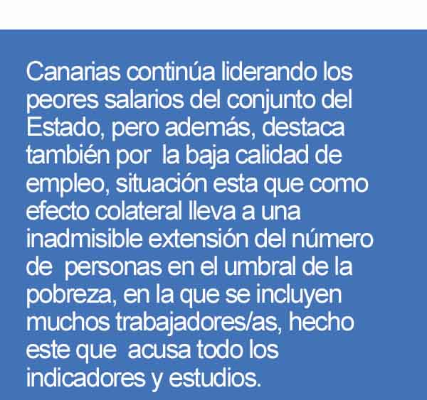 Canarias continúa liderando los peores salarios del conjunto del Estado, pero además, destaca también por  la baja calidad de empleo, situación esta que como efecto colateral lleva a una inadmisible extensión del número de  personas en el umbral de la pobreza, en la que se incluyen muchos trabajadores/as, hecho este que  acusa todo los indicadores y estudios.