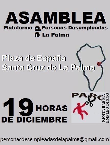 Este el lunes 19 de diciembre, a las 19 horas, La Plataforma de Personas Desempleadas de La Palma, realizará un encuentro en La Plaza de España de Santa Cruz de La Palma, abierto a toda la ciudadanía.