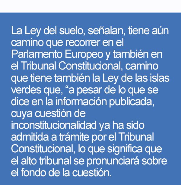 La Ley del suelo, señalan, tiene aún camino que recorrer en el Parlamento Europeo y también en el Tribunal Constitucional, camino que tiene también la Ley de las islas verdes que, “a pesar de lo que se dice en la información publicada, cuya cuestión de inconstitucionalidad ya ha sido admitida a trámite por el Tribunal Constitucional, lo que significa que el alto tribunal se pronunciará sobre el fondo de la cuestión.