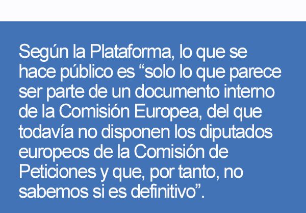 Según la Plataforma, lo que se hace público es “solo lo que parece ser parte de un documento interno de la Comisión Europea, del que todavía no disponen los diputados europeos de la Comisión de Peticiones y que, por tanto, no sabemos si es definitivo”.