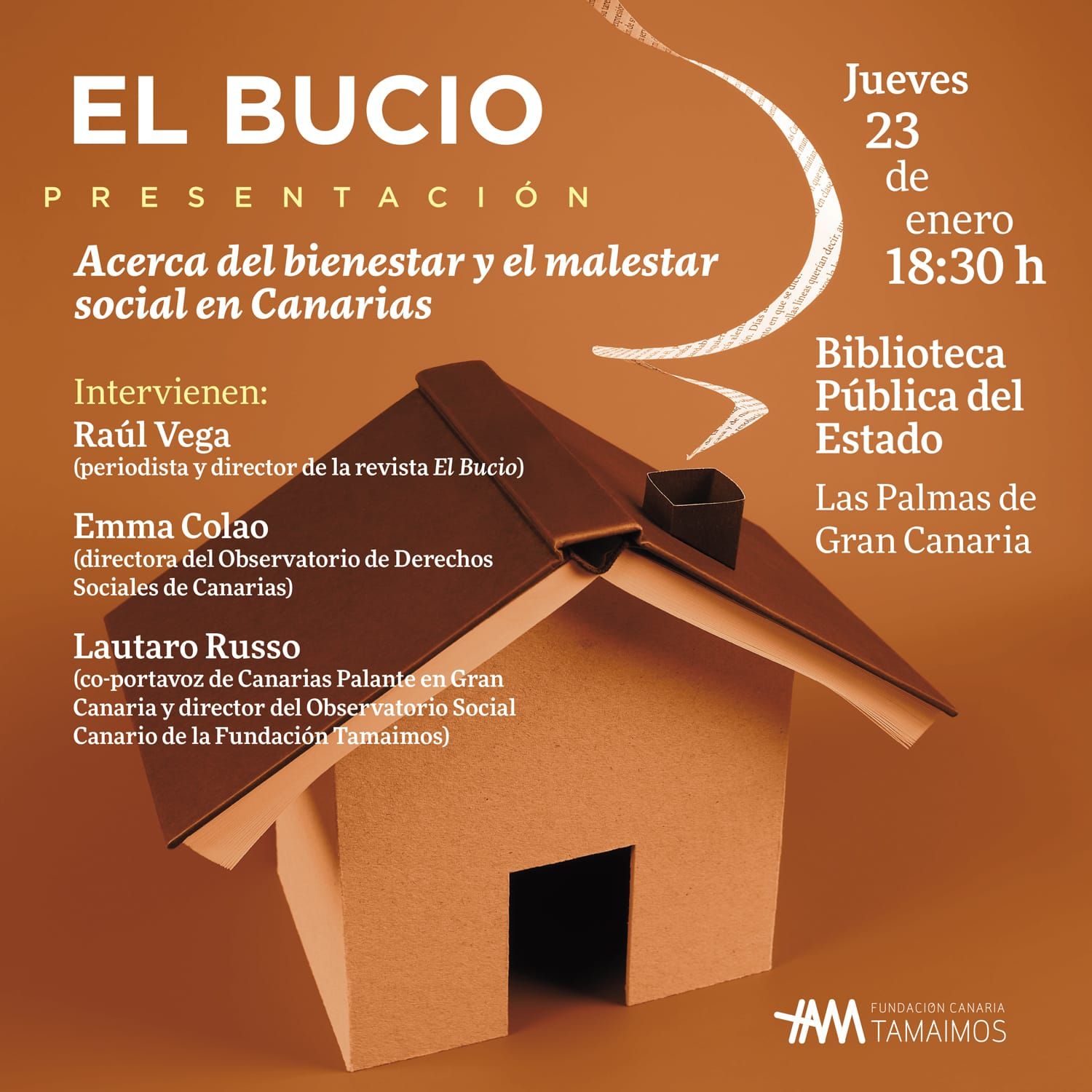 En dicho diálogo aparecerán temas como los vergonzosos datos de pobreza y bienestar en Canarias, los derechos sociales, la resistencia en movimientos como los que arribaron a las manifestaciones del 20-A y el 20-O, o el papel que pueden jugar los observatorios sociales para analizar todas estas cuestiones. El formato elegido permitirá la participación del público presente, que además podrá adquirir la revista en el acto a un precio de 10 euros. El Bucio también se encuentra en librerías, bazares y algunos espacios museísticos de las Islas.