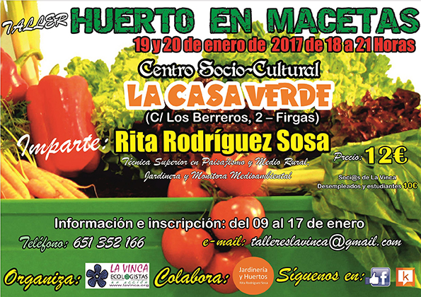 El coste de dicho Taller es de 12 € para el público en general, y de 10 € para personas desempleadas o asociadas a La Vinca Ecologistas en Acción; y se celebrará en el Centro Socio-Cultural LA CASA VERDE de Firgas (Los Berreros, nº 2), en horario de 18.00 a 21.00 horas, durante las jornadas del jueves 19 y viernes 20 de enero de 2017.