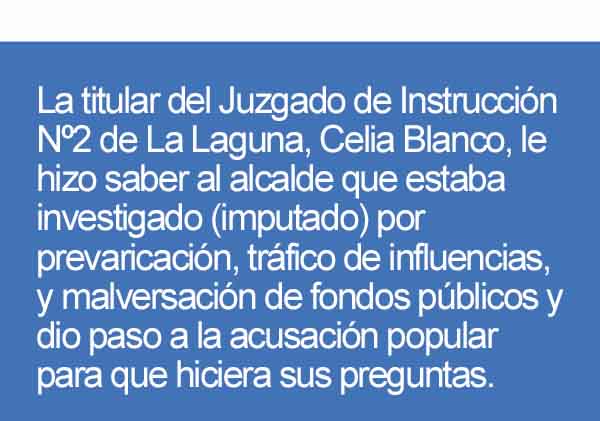 La titular del Juzgado de Instrucción Nº2 de La Laguna, Celia Blanco, le hizo saber al alcalde que estaba investigado (imputado) por prevaricación, tráfico de influencias, y malversación de fondos públicos y dio paso a la acusación popular para que hiciera sus preguntas.