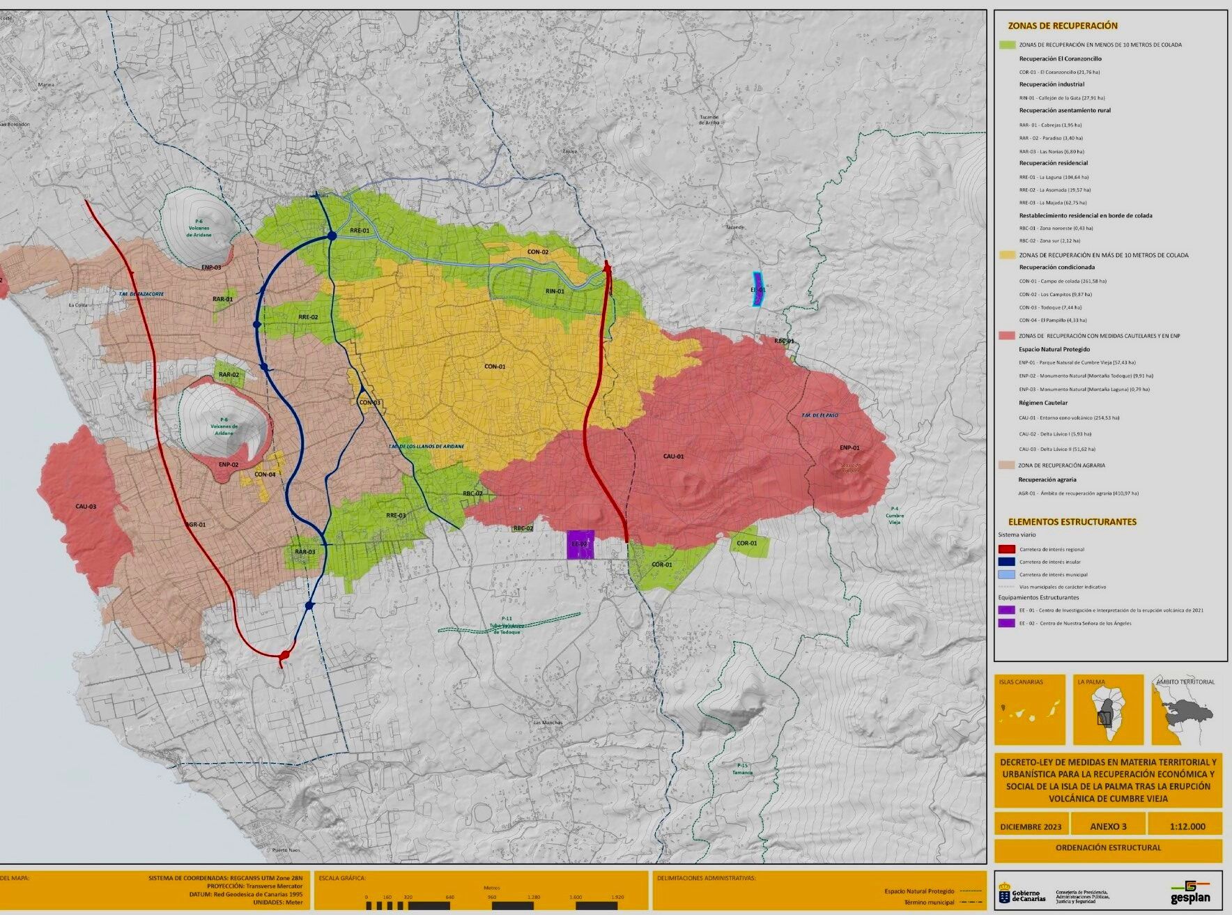Hay que recordar que este grupo de afectados tiene sus terrenos sujetos a un régimen jurídico de protección cautelar (zona roja en el mapa de la nueva ordenación del ámbito que cubrió la lava, vigente desde diciembre de 2023 por decreto ley del Gobierno canario).