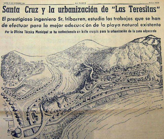 El primer intento conocido de urbanizar la playa de Las Teresitas lo publicó el 31 de diciembre de 1956 el diario La Tarde. El proyecto del ingeniero Ramón Iribarren sitúa un hotel justo encima de la batería militar y una urbanización en la zona adyacente. Ha llovido mucho desde entonces, incluyendo la riada que, en octubre del 2014, arrastró desde el barranco de San Andrés cientos de toneladas de escombros incluyendo muchos animales muertos, como perros, gallinas, gatos o ratas, lo que hizo exclamar al responsable de mantener en condiciones toda la isla de Tenerife, don Alonso (era costumbre medieval poner el don al apellido), presidente del Cabildo “Es que de meteorología sólo avisaron con 24 horas de antelación”, como si hubiera cambiado algo el hecho de que se hubiese anunciado con una semana, un año o diez. Don Alonso cerró la playa más de diez días para ocultar el descalabro producido a los visitantes.