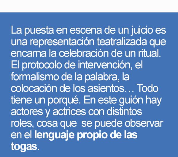 La puesta en escena de un juicio es una representación teatralizada que encarna la celebración de un ritual. El protocolo de intervención, el formalismo de la palabra, la colocación de los asientos… Todo tiene un porqué. En este guión hay actores y actrices con distintos roles, cosa que se puede observar en el lenguaje propio de las togas.