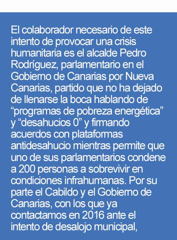 El colaborador necesario de este intento de provocar una crisis humanitaria es el alcalde Pedro Rodríguez, parlamentario en el Gobierno de Canarias por Nueva Canarias, partido que no ha dejado de llenarse la boca hablando de “programas de pobreza energética” y “desahucios 0” y firmando acuerdos con plataformas antidesahucio mientras permite que uno de sus parlamentarios condene a 200 personas a sobrevivir en condiciones infrahumanas. Por su parte el Cabildo y el Gobierno de Canarias, con los que ya contactamos en 2016 ante el intento de desalojo municipal, conocen perfectamente nuestra situación, al menos con el agua (pues en su día se les dijo que no disponíamos de agua de abasto), y se han inhibido completamente permitiendo que más 70 familias permanezcan, en ese “Caribe europeo” del que se sienten tan orgullosos, sin agua y sin luz.