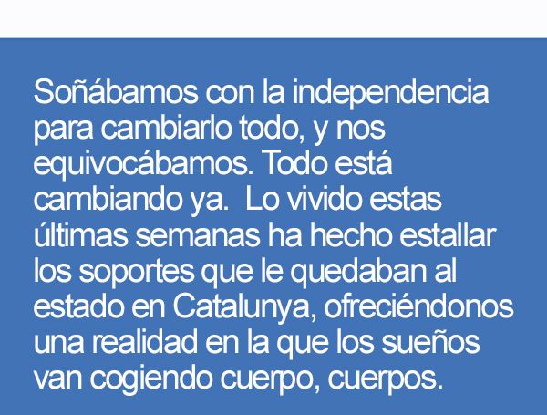 Soñábamos con la independencia para cambiarlo todo, y nos equivocábamos. Todo está cambiando ya.  Lo vivido estas últimas semanas ha hecho estallar los soportes que le quedaban al estado en Catalunya, ofreciéndonos una realidad en la que los sueños van cogiendo cuerpo, cuerpos. Cuerpos que defendieron la dignidad y sufrieron la violencia y el miedo; cuerpos que se articularon por encima de banderas, fronteras e identidades, construyendo un vínculo social, un pueblo, que ha desconectado del estado y ha empezado a gobernarse a sí mismo.