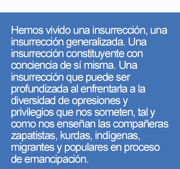 Hemos vivido una insurrección, una insurrección generalizada. Una insurrección constituyente con conciencia de sí misma. Una insurrección que puede ser profundizada al enfrentarla a la diversidad de opresiones y privilegios que nos someten, tal y como nos enseñan las compañeras zapatistas, kurdas, indígenas, migrantes y populares en proceso de emancipación. Nos encontramos ante la oportunidad de poner en el centro la vida y los múltiples procesos de liberación en el que estamos insertas, de construir un proceso constituyente que gravite en torno al poder popular materializado en la revuelta; un proceso constituyente que emane del conjunto y de la diversidad de las luchas de liberación presentes en nuestros territorios. Tenemos la oportunidad de cuestionarlo todo. De cuestionar el capitalismo, el patriarcado, el colonialismo y el racismo que padecemos, y del que también nos beneficiamos. Tenemos la oportunidad de disputar los supuestos consensos sobre la UE, el FMI, el BCE y el Euro. De poner negro sobre blanco que la Unión Europea no es más que una forma concreta a través de la cual el Centro subsume a las Periferias, tanto a las que están dentro de sus fronteras como las que están afuera, y que el Euro no es más que el brazo armado que facilita el intercambio desigual y genera dependencia. Tenemos la oportunidad de cuestionar la dominación hetero-patriarcal en todas y cada una de las estructuras políticas, económicas y sociales que se deberán construir. Tenemos la oportunidad de desalambrar el conjunto de relaciones coloniales y racistas sobre la que se asienta nuestra supremacía blanca. Tenemos la oportunidad de construir un proceso constituyente capaz de convertir en espacios de soberanía todas y cada una de las luchas que la constituyen.