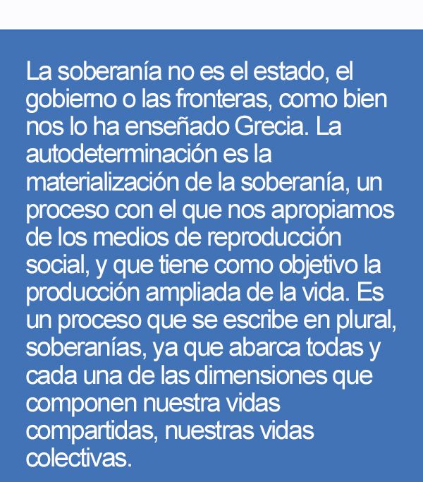 La soberanía no es el estado, el gobierno o las fronteras, como bien nos lo ha enseñado Grecia. La autodeterminación es la materialización de la soberanía, un proceso con el que nos apropiamos de los medios de reproducción social, y que tiene como objetivo la producción ampliada de la vida. Es un proceso que se escribe en plural, soberanías, ya que abarca todas y cada una de las dimensiones que componen nuestra vidas compartidas, nuestras vidas colectivas.