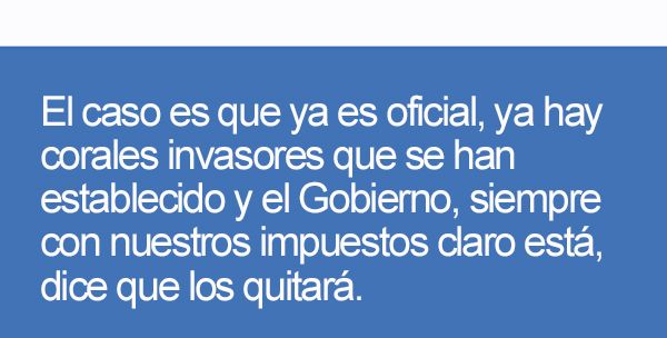 El caso es que ya es oficial, ya hay corales invasores que se han establecido y el Gobierno, siempre con nuestros impuestos claro está, dice que los quitará. Otra cosa es que eso pueda ser sólo la punta del iceberg de un asunto que puede transformar de manera casi radical la biología de nuestro entorno marino tal y como hoy la conocemos. En tiempo será, cuando hay dinero e intereses por medio siempre funciona así, el que dirá si este invento ha merecido la pena o si unos cuanto se están poniendo las botas a costa de nuestro entorno natural. Nada nuevo bajo el Sol, por otro lado.