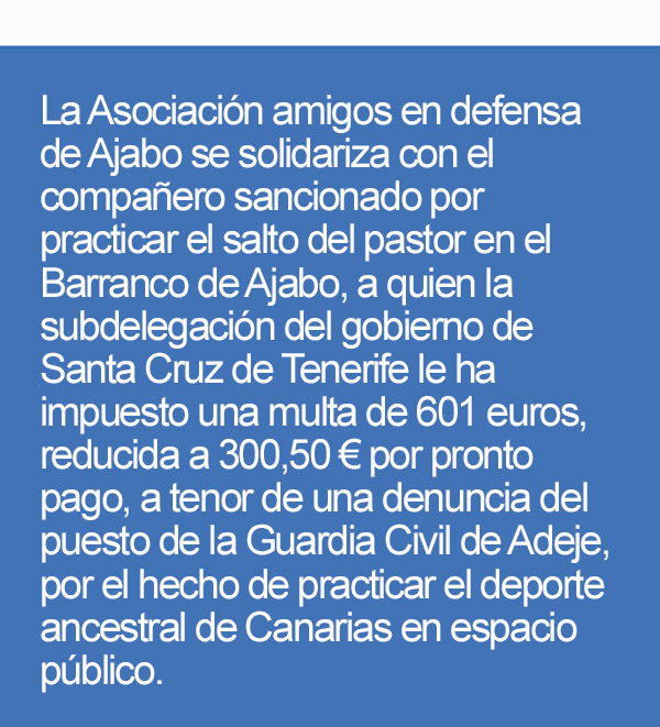 La Asociación amigos en defensa de Ajabo se solidariza con el compañero sancionado por practicar el salto del pastor en el Barranco de Ajabo, a quien la subdelegación del gobierno de Santa Cruz de Tenerife le ha impuesto una multa de 601 euros, reducida a 300,50 € por pronto pago, a tenor de una denuncia del puesto de la Guardia Civil de Adeje, por el hecho de practicar el deporte ancestral de Canarias en espacio público.