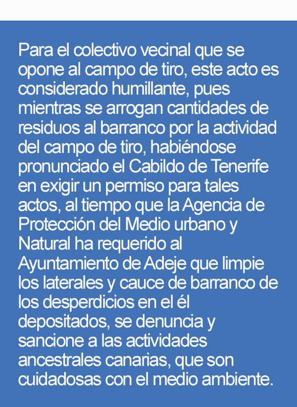 Para el colectivo vecinal que se opone al campo de tiro, este acto es considerado humillante, pues mientras se arrogan cantidades de residuos al barranco por la actividad del campo de tiro, habiéndose pronunciado el Cabildo de Tenerife en exigir un permiso para tales actos, al tiempo que la Agencia de Protección del Medio urbano y Natural ha requerido al Ayuntamiento de Adeje que limpie los laterales y cauce de barranco de los desperdicios en el él depositados, se denuncia y sancione a las actividades ancestrales canarias, que son cuidadosas con el medio ambiente, «¡el mundo al revés!», afirman.