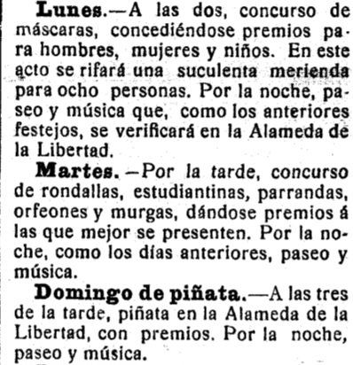 Lunes. A las dos, concurso de máscaras, concediéndose premios para hombres, mujeres y niños. En este acto se rifará una suculenta merienda para ocho personas. Por la noche, paseo y música que, como los anteriores festejos, se verificará en la Alameda de la Libertad.