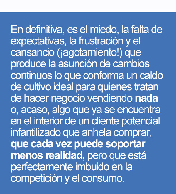 En definitiva, es el miedo, la falta de expectativas, la frustración y el cansancio (¡agotamiento!) que produce la asunción de cambios continuos lo que conforma un caldo de cultivo ideal para quienes tratan de hacer negocio vendiendo nada o, acaso, algo que ya se encuentra en el interior de un cliente potencial infantilizado que anhela comprar, que cada vez puede soportar menos realidad, pero que está perfectamente imbuido en la competición y el consumo.