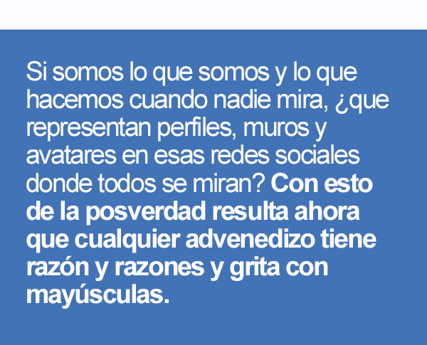 Si somos lo que somos y lo que hacemos cuando nadie mira, ¿que representan perfiles, muros y avatares en esas redes sociales donde todos se miran? Con esto de la posverdad resulta ahora que cualquier advenedizo tiene razón y razones y grita con mayúsculas.