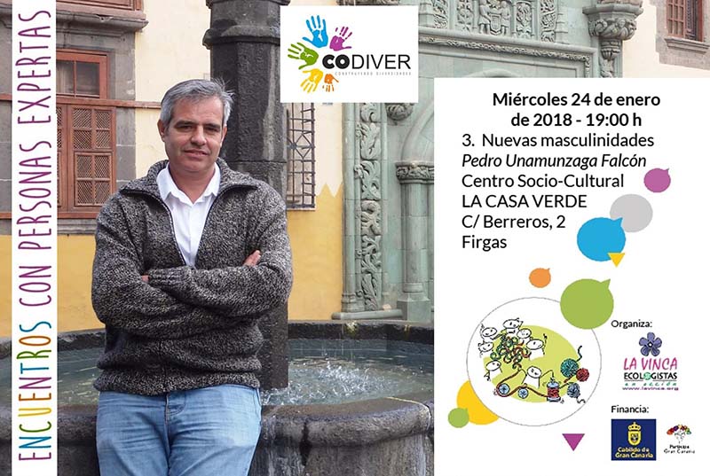 El Proyecto “Construyendo Diversidades – CODIVER 2017”, está organizado por el colectivo LA VINCA Ecologistas en Acción. La tercera de estas sesiones de diálogo con Personas Expertas se desarrollará el miércoles 24 de enero de 2018, a las 19.00 horas, en el Centro Socio-Cultural LA CASA VERDE (C/ Los Berreros, nº 2 – Firgas) y se contará como EXPERTO invitado con Pedro Unamunzaga Falcón, que hablará sobre nuevas masculinidades, con el siguiente formato:
