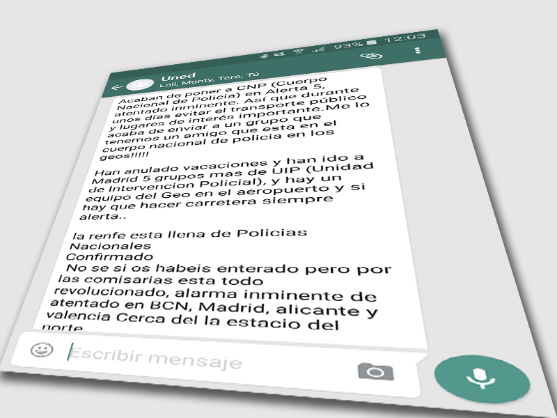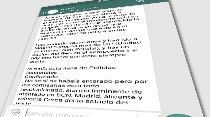 “Acaban de poner a CNP (Cuerpo Nacional de Policia) en Alerta 5, atentado inminente. Así que durante unos días evitar el transporte público y lugares de interés importante.Me lo acaba de enviar a un grupo que tenemos un amigo que esta en el cuerpo nacional de policia en los geos!!!!!