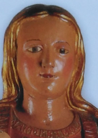 La actual Virgen del Socorro es una candelaria invertida, con el niño en el brazo izquierdo y la vela en la mano derecha. Realizada antes de 1643, incluye dos características de interés: viste túnica roja adornada con flores y letras doradas de tipo latino, y en el pecho figura el versículo 16 del capítulo II del Cantar de los Cantares. En el gran trabajo monográfico de María Jesús Riquelme2, se describen una veintena de imágenes de bulto de la advocación estudiada de los siglos XVI, XVII y XVIII, resultando que únicamente las de Adeje y El Socorro de Güímar incluyen letras en el cuerpo de la talla.