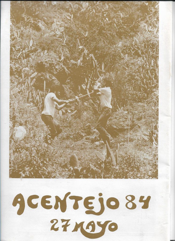 El año 83 la afluencia de público sobrepasó ya el centenar de personas y desde el Centro “Amílcar Cabral” nos planteamos que aquella tenía que llegar a ser una verdadera celebración multitudinaria de forma que nuestro colonizado y transculturado pueblo adquiriera conciencia de lo que aquella epopeya significó. Así, al año siguiente, en 1984, se celebró el que hasta la fecha ha sido, el mejor y más numeroso ACENTEJO. La celebración, a la que concurrieron más de 1.500 personas – muchas de ellas vecinos del lugar- y con importantes representaciones de compañeros de Tamarán y Titerogakat, tuvo una primera parte donde, tras la presentación del acto que hizo un destacado miembro del Centro, Pantaleón Hernández, actuaron sobre el escenario cedido por el Ayuntamiento matancero, los grupos folklóricos “Los Sauces” de El Sauzal, “Tinizara” y “17 de Enero” de la Matanza, y “El Moral” de San Miguel de Geneto, los cantautores Andrés Molina, Alberto Cañete y Rogelio Botanz, los poetas Francisco Viñas, Isabel Medina, Tomás Chávez y Chucho Dorta (Benahuya). Luego me tocó a mí, como Presidente del Centro, glosar la historia de la fecha y la significación del acto y tras ello se hizo un homenaje a la entonces ya casi centenaria victoriera, Dª Adela Hernández, la última alfarera del Norte de Tenerife, que, con palabras sentidas, subrayó la continuidad de una línea que unía a aquellos antepasados que libraron la batalla con los que en ese momento la celebrábamos, hilo conductor de una etnia que no se pierde en el tiempo, carácter continuo que ayudó a realzar una magnífica exhibición de Lucha Canaria (Vidal Martín, Chani y Cecilio del Santa Cruz C.L. y Manolo Mendoza del Tacuense), otra de Juego del Palo de la Escuela de Aguere y la fabricación de cerámica en vivo del Grupo Aitiden del propio Centro. Para el colofón del acto, en la Compensatoria de Adultos de la Matanza, que dirigía Rogelio Botanz, se confeccionaron, con chapa de hierro, armaduras, escudos, corazas y espadas, además de trajes de los soldados españoles de la época y suficientes tamarcos guanches, escenificándose, con el sonido de fondo de los bucios de “Los Benijeros” la batalla a lo largo del barranco, escenificación en que Rogelio –que actuaba de capitán español- corrió verdadero peligro físico a manos del entusiasmo, siempre contagioso, de Behahuya.