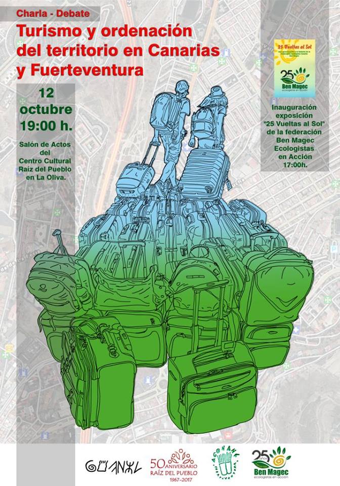 Las actividades seguirán por la tarde en el Centro Cultural Raíz del Pueblo, en La Oliva, donde a las 17:00 horas se inaugurará una exposición sobre los 25 años del nacimiento de la federación ecologista en Canarias, que aglutinó a la mayor parte de los colectivos ecologistas existentes en el momento con el objetivo común de defender el territorio y el patrimonio natural y cultural del archipiélago compartiendo las diferentes luchas locales. A las 19:00 horas comenzará la charla-debate con el título “Turismo y ordenación del territorio en Canarias y Fuerteventura” donde se reflexionará sobre el nuevo escenario de burbuja del turismo y la construcción que se pretende poner en marcha en toda Canarias, con el fin de generar un proceso de análisis crítico desde la ciudadanía  frente a este proceso de  turistización absoluta del archipiélago.