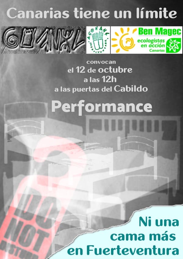 Ben Magec Ecologistas en Acción y los colectivos Guanil y Agonane  tiene previstos en la isla de Fuerteventura actos de protesta y sensibilización para este próximo viernes día 12 de octubre. El primero de ellos tendrá lugar a las 12 de la mañana y consistirá en un performance a las puertas del propio Cabildo de Fuerteventura, en Puerto del Rosario, con el lema “Canarias tiene un límite: Ni una cama más en Fuerteventura”. La finalidad de la misma es mostrar el rechazo existente por parte de la ciudadanía hacia el nuevo PIOF y los hoteles proyectados en lugares como El Cotillo, que pretenden generar nuevos enclaves de turismo masivo en la isla que tendrán como resultado la transformación irreversible el paisaje, expulsarán a la población local y seguirán comprometiendo los escasos recursos insulares.