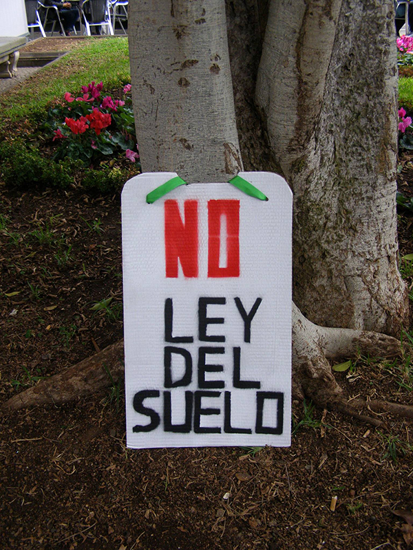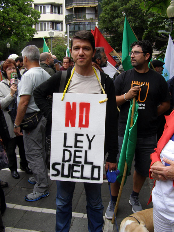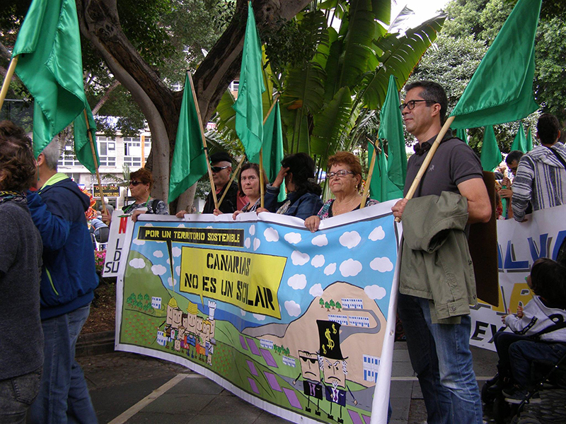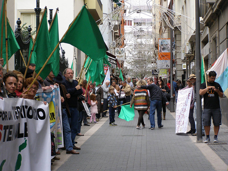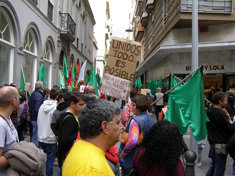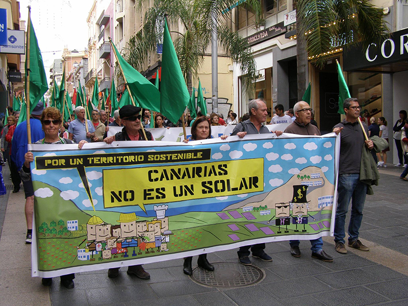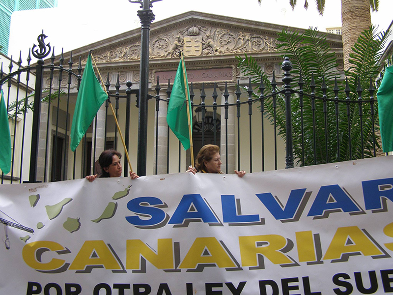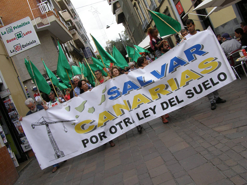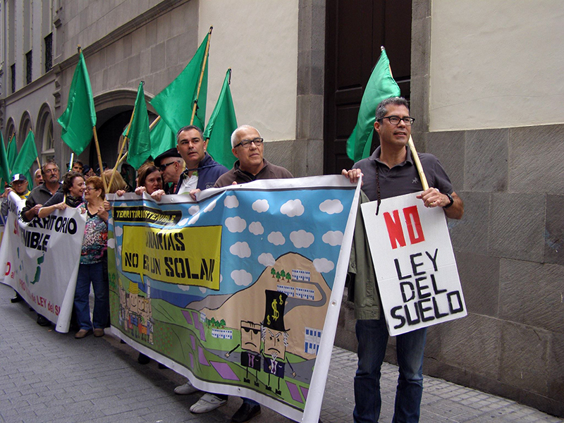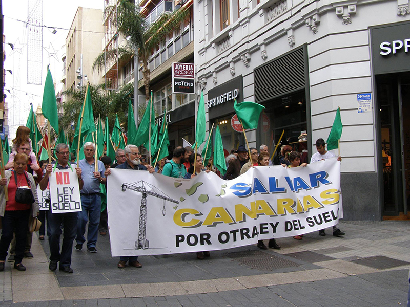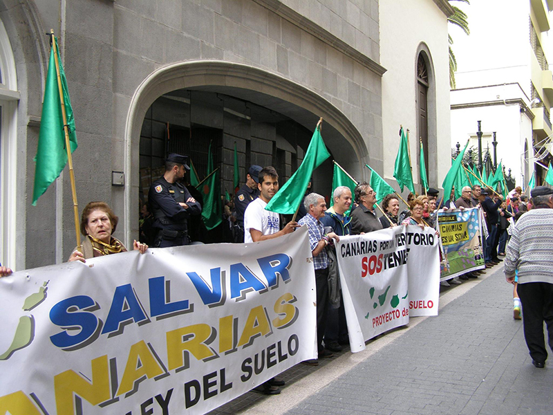 Con esta manifestación la Plataforma Canarias por un Desarrollo Sostenible quiere dejar bien claro que el Proyecto de Ley del Suelo, que el lunes empezará a debatirse en comisión parlamentaria, no cumple mínimamente el objetivo de servir al pueblo. En caso de ser aprobada, esta ley no estará al servicio de los derechos y necesidades de nuestra gente, sino del lucro y la avaricia de una parte reducidísima de la población: los caciques, especuladores y grandes empresarios del ladrillo y el cemento, a los que el Gobierno de Fernando Clavijo quiere vender nuestro más preciado patrimonio, la tierra en la que hemos nacido y en la que han vivido nuestros abuelos y nuestros padres.