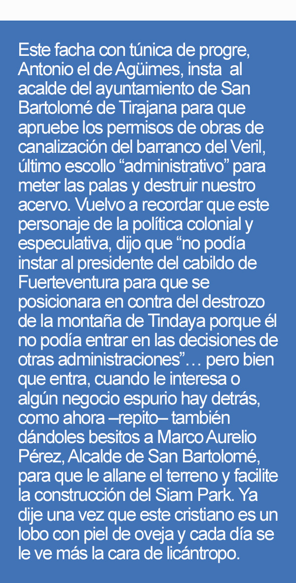 Este facha con túnica de progre, Antonio el de Agüimes, insta al acalde del ayuntamiento de San Bartolomé de Tirajana para que apruebe los permisos de obras de canalización del barranco del Veril, último escollo “administrativo” para meter las palas y destruir nuestro acervo. Vuelvo a recordar que este personaje de la política colonial y especulativa, dijo que “no podía instar al presidente del cabildo de Fuerteventura para que se posicionara en contra del destrozo de la montaña de Tindaya porque él no podía entrar en las decisiones de otras administraciones”… pero bien que entra, cuando le interesa o algún negocio espurio hay detrás, como ahora –repito– también dándoles besitos a Marco Aurelio Pérez, Alcalde de San Bartolomé, para que le allane el terreno y facilite la construcción del Siam Park. Ya dije una vez que este cristiano es un lobo con piel de oveja y cada día se le ve más la cara de licántropo.