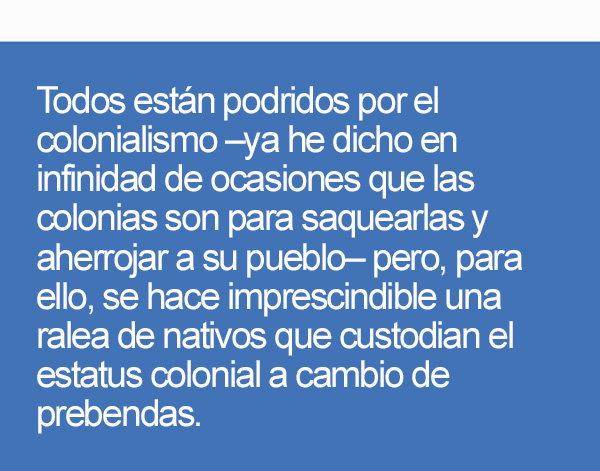 Todos están podridos por el colonialismo –ya he dicho en infinidad de ocasiones que las colonias son para saquearlas y aherrojar a su pueblo– pero, para ello, se hace imprescindible una ralea de nativos que custodian el estatus colonial a cambio de prebendas.