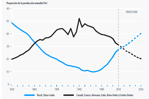 A continuación añado un gráfico donde se refleja que el año 2013 fue el año cero de la nueva era, donde se cruzan el auge de los países crecientes con la caída de los países pertenecientes al mundo occidental.
