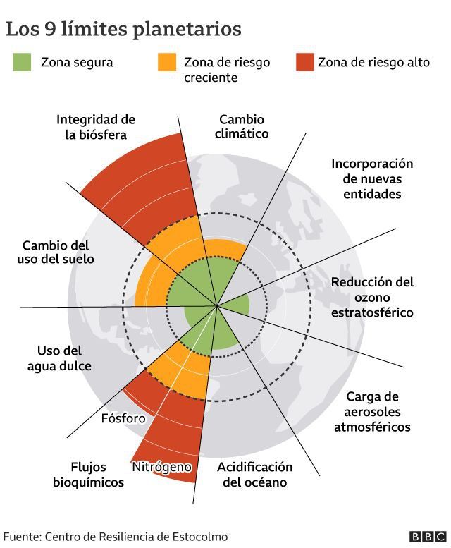 En 2009, un grupo de investigadores del Centro de Resiliencia de Estocolmo publicó un estudio sobre estas hipotéticas condiciones que podrían garantizar la sostenibilidad de la humanidad y del planeta, identificando nueve parámetros. Estos “límites planetarios” se pueden observar en el siguiente gráfico: