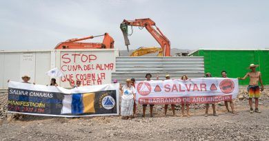 Según los activistas acampados, el proyecto que pretende hacerse en el Puertito de Adeje “representa la punta del iceberg de un modelo económico trasnochado que solo provoca dependencia del turismo y pérdida de competitividad del propio sector, pérdida de suelo agrícola y de soberanía alimentaria…