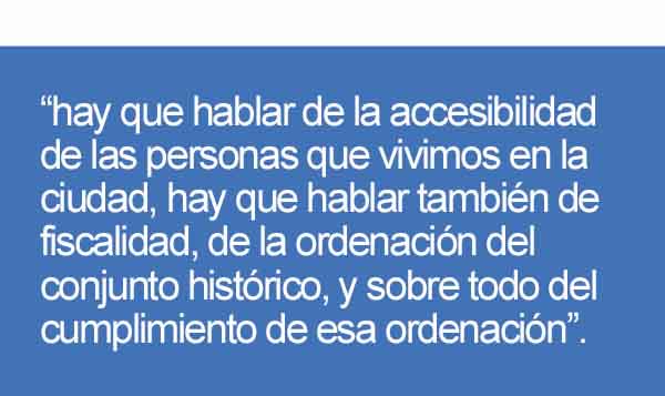 Santiago Pérez señala que “hay que hablar de la accesibilidad de las personas que vivimos en la ciudad, hay que hablar también de fiscalidad, de la ordenación del conjunto histórico, y sobre todo del cumplimiento de esa ordenación. Porque muchas veces tiene uno la sensación de que hay dos varas de medir: una para la ciudadanía y otra para las grandes compañías de servicios que campan a sus anchas; las cosas de los ciudadanos se miran con lupa y con las compañías se hace la vista gorda”.