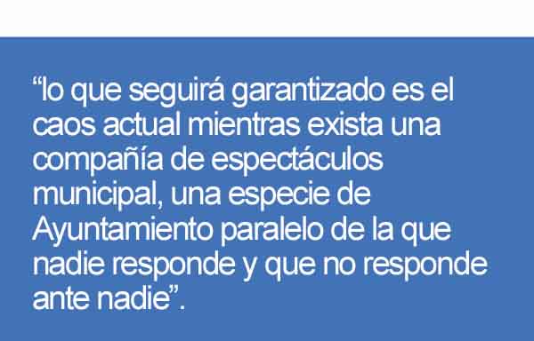 En otro caso, “lo que seguirá garantizado es el caos actual mientras exista una compañía de espectáculos municipal, una especie de Ayuntamiento paralelo de la que nadie responde y que no responde ante nadie”.