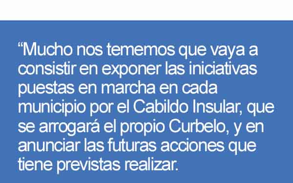Antes bien, para Sí se puede, el formato de este evento es claramente preelectoral, “mucho nos tememos que vaya a consistir en exponer las iniciativas puestas en marcha en cada municipio por el Cabildo Insular, que se arrogará el propio Curbelo, y en anunciar las futuras acciones que tiene previstas realizar. Como mucho enumerará lo que entiende que han sido avances en materia turística en últimos años en La Gomera y en Valle Gran Rey”.