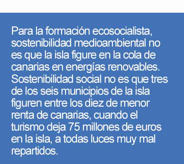 Para la formación ecosocialista, sostenibilidad medioambiental no es que la isla figure en la cola de canarias en energías renovables. Sostenibilidad social no es que tres de los seis municipios de la isla figuren entre los diez de menor renta de canarias, cuando el turismo deja 75 millones de euros en la isla, a todas luces muy mal repartidos. Sostenibilidad social no es que las cifras de paro insular crezcan de forma insoportable en ausencia de los recurrentes planes de empleo del Cabildo y Ayuntamientos. Sostenibilidad económica no es que la isla tenga menos superficie y producción agrícola que ninguna otra del archipiélago. Sostenibilidad social no es que las comunidades rurales de la isla sufran despoblación, en gran parte debido al abandono institucional. Sostenibilidad ambiental no es la nula falta de gestión de los espacios naturales protegidos por parte del Cabildo y que un incendio haya podido arrasar gran parte de la isla como pasó en 2012.