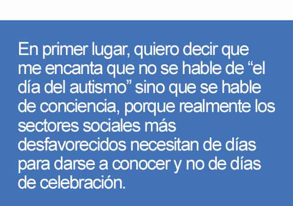 En primer lugar, quiero decir que me encanta que no se hable de “el día del autismo” sino que se hable de conciencia, porque realmente los sectores sociales más desfavorecidos necesitan de días para darse a conocer y no de días de celebración. Un ejemplo de esto es el 8 de marzo, que parece que se está convirtiendo en un día de exaltación de la mujer y que es un día de conciencia igual que el de hoy. ¿O es que a alguien se le ocurriría felicitar a mi hijo por tener autismo? Yo creo que no. Es mejor tener conciencia de su condición y buscar fórmulas para hacerle ser más partícipe de la sociedad, ¿no les parece?