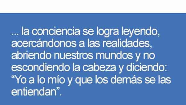 Finalizo diciendo que la conciencia se logra leyendo, acercándonos a las realidades, abriendo nuestros mundos y no escondiendo la cabeza y diciendo: “Yo a lo mío y que los demás se las entiendan”. Porque la toma de conciencia no depende sólo de que las personas con autismo salgan de su mundo, sino de que el mundo también se abra a ellas.