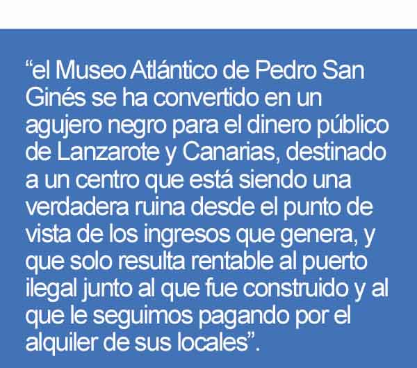 Para Tomás López, consejero y portavoz de la formación transformadora en el Cabildo “el Museo Atlántico de Pedro San Ginés se ha convertido en un agujero negro para el dinero público de Lanzarote y Canarias, destinado a un centro que está siendo una verdadera ruina desde el punto de vista de los ingresos que genera, y que solo resulta rentable al puerto ilegal junto al que fue construido y al que le seguimos pagando por el alquiler de sus locales”. En este sentido, desde Somos Lanzarote recuerdan que de los más 2,8 millones de turistas que visitaron los centros turísticos en el pasado 2017, tan solo 8 mil decidieron acudir al Museo del británico Jason deCaires, lo que supone un mísero 0,3% de las entradas, a pesar de los cuantiosos gastos que genera.