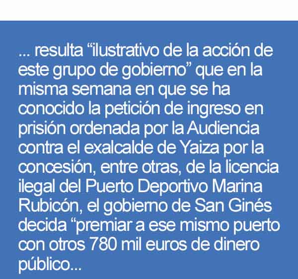 Para Somos Lanzarote resulta “ilustrativo de la acción de este grupo de gobierno” que en la misma semana en que se ha conocido la petición de ingreso en prisión ordenada por la Audiencia contra el exalcalde de Yaiza por la concesión, entre otras, de la licencia ilegal del Puerto Deportivo Marina Rubicón, el gobierno de San Ginés decida “premiar a ese mismo puerto con otros 780 mil euros de dinero público de inversión en un mueso submarino que supone un lastre tanto para la imagen de los centros turísticos como para su propia viabilidad económica”, concluyen.