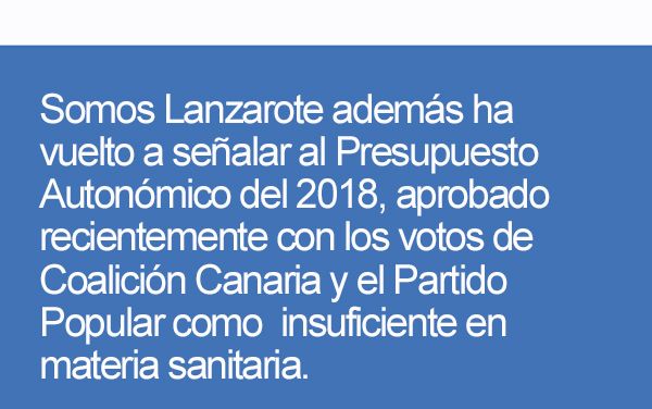 Somos Lanzarote además ha vuelto a señalar al Presupuesto Autonómico del 2018, aprobado recientemente con los votos de Coalición Canaria y el Partido Popular como insuficiente en materia sanitaria. La formación insular insiste en que debería contemplar partidas para el Búnker de Radioterapia, para la ampliación del Molina Orosa, una partida suficiente para el Centro de Salud de Argana, o para la Unidad de Hemodinámica.